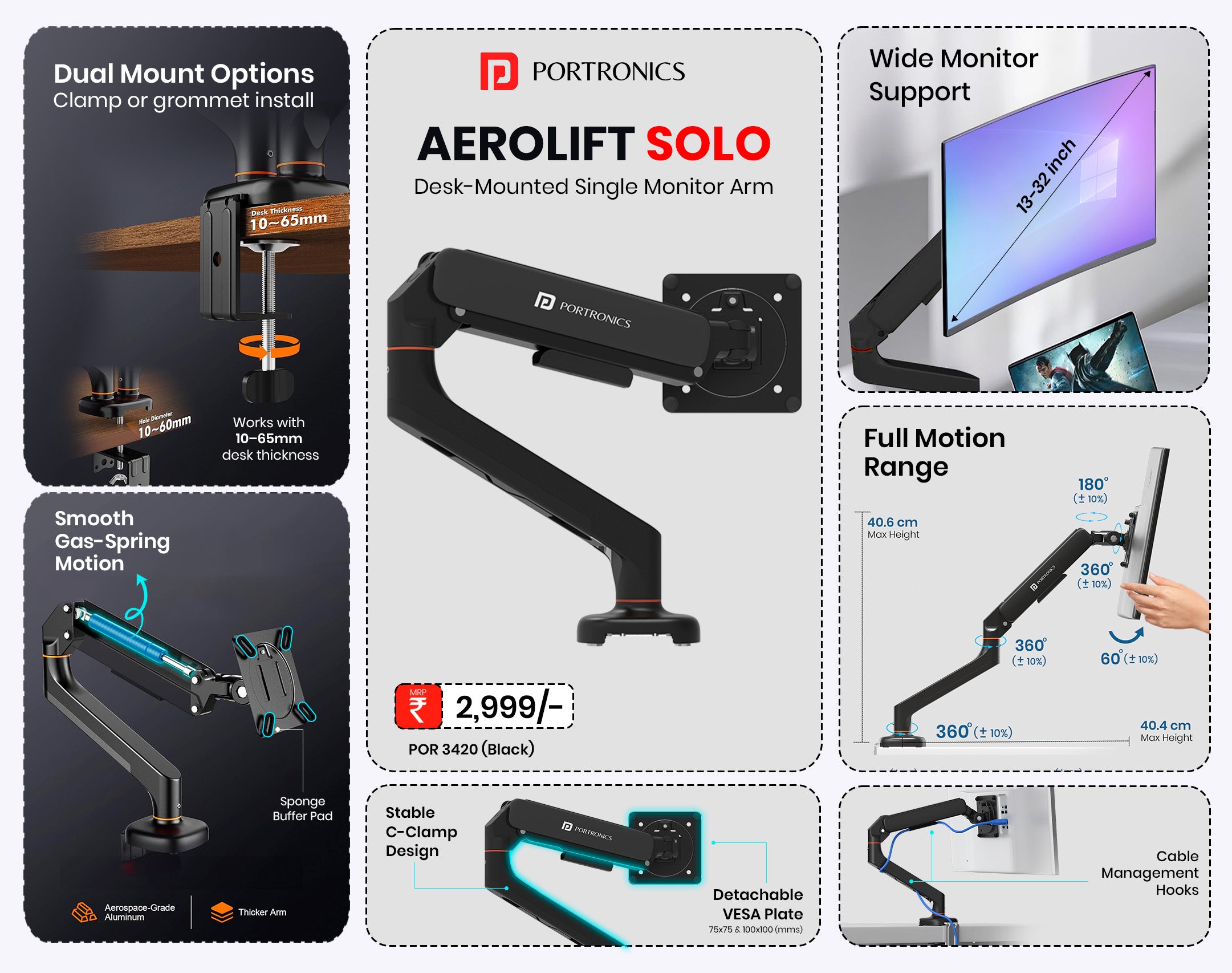 Desk Mount for 13–32 Inch Screens | VESA 75x75 & 100x100 mm | Full Motion Tilt/Swivel/Rotation | C-Clamp & Grommet Installation | Aluminium Build
