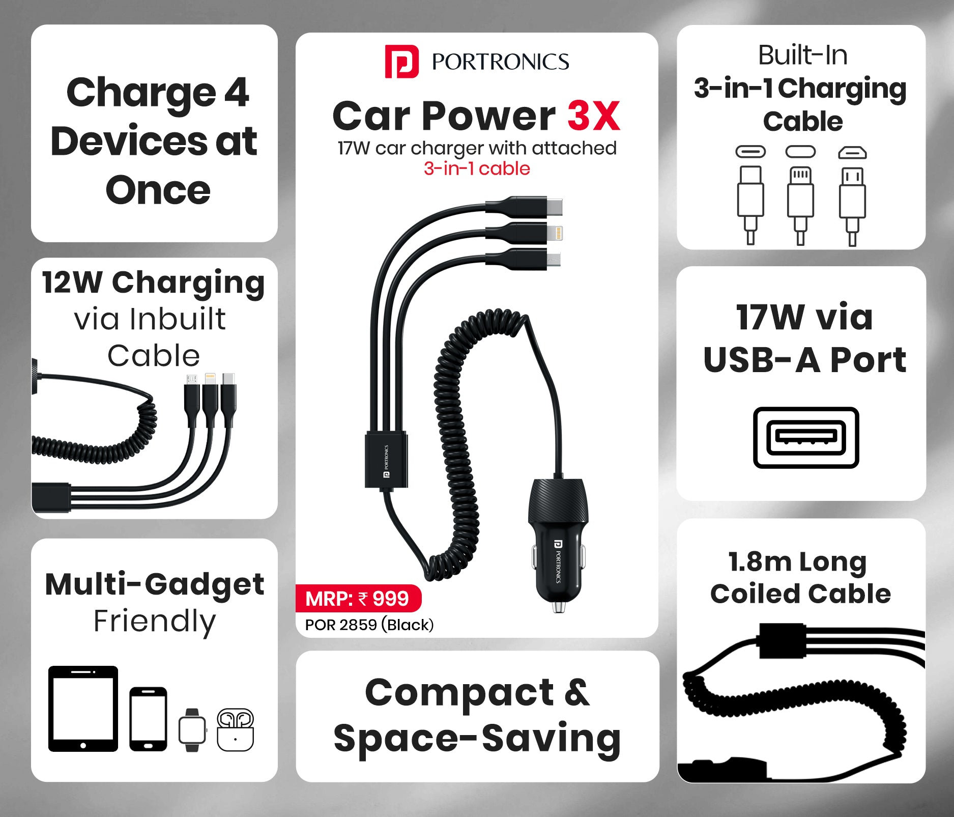 12W 3-in-1 Coiled Cable (Type-C, Lightning, Micro-USB)| 17W USB-A Port | Charge 4 Devices at Once | For Phones, Tablets, Earbuds & More