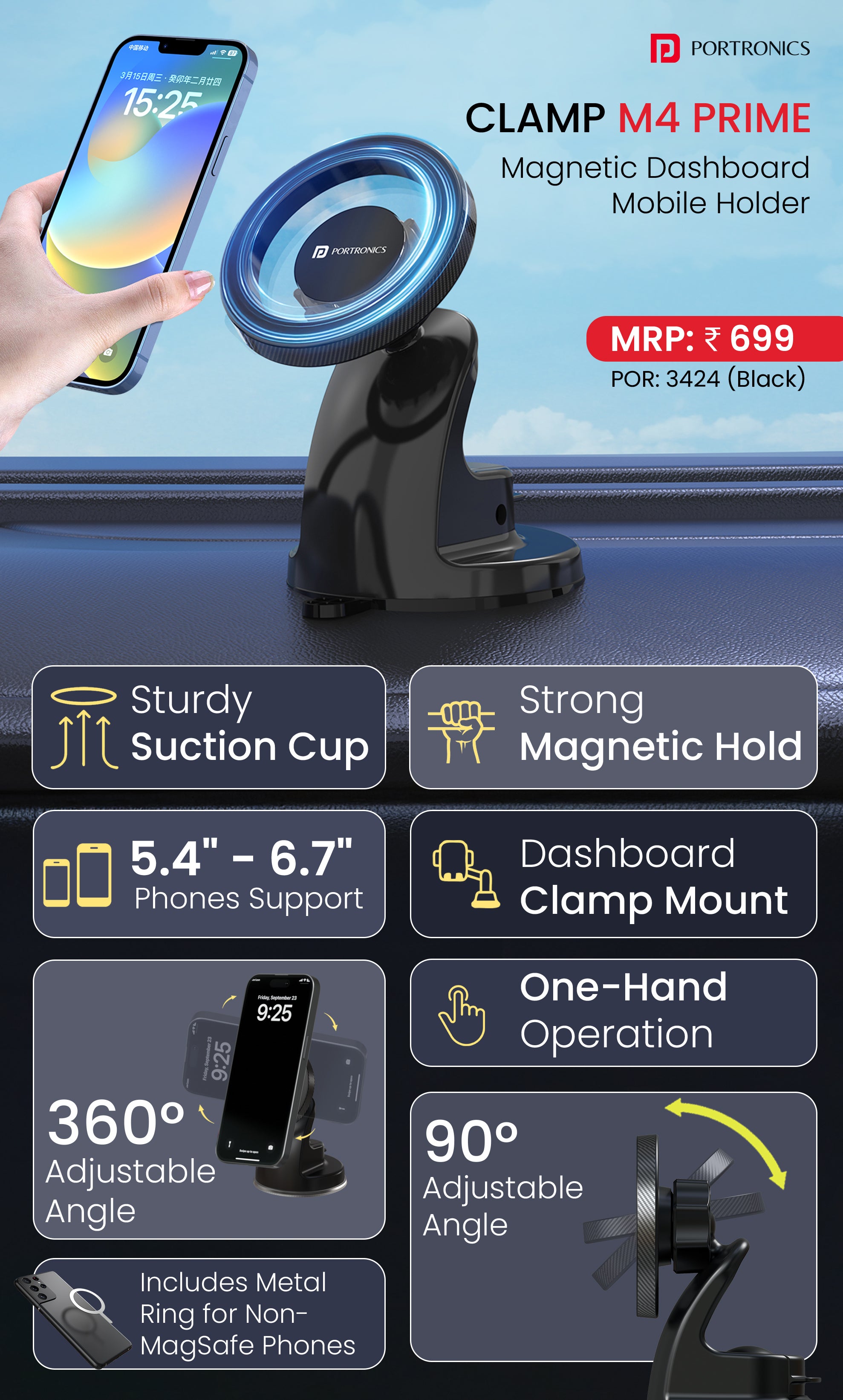 Windshield & Dashboard Mountable | Strong Suction Cup | 360° Rotation & 90° Tilt Adjustment | Metal Ring Included | Fits 5.4–6.7 Inch Smartphones