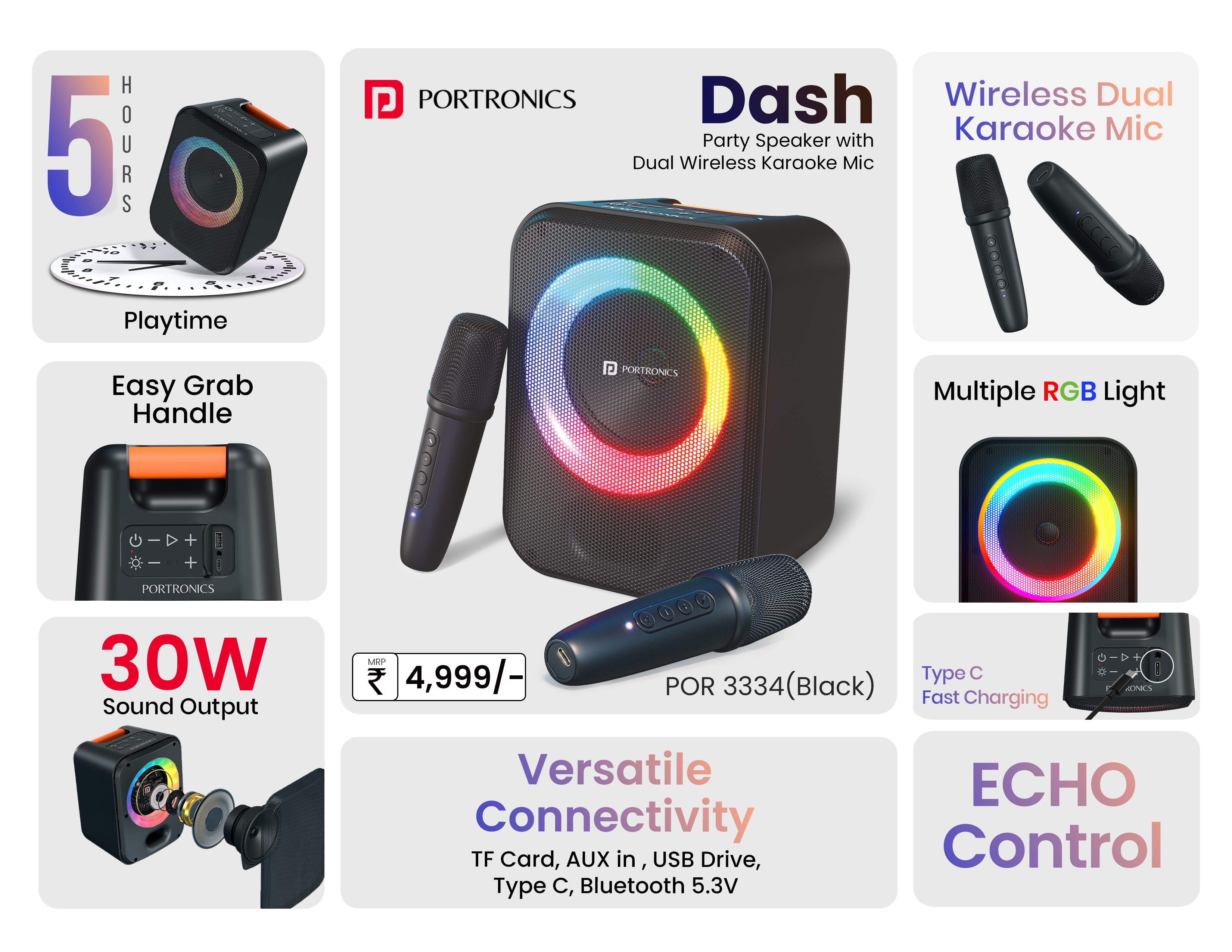 30W Sound Output | Bluetooth Version 5.4 | ECHO Control | Upto 5 Hours Playtime