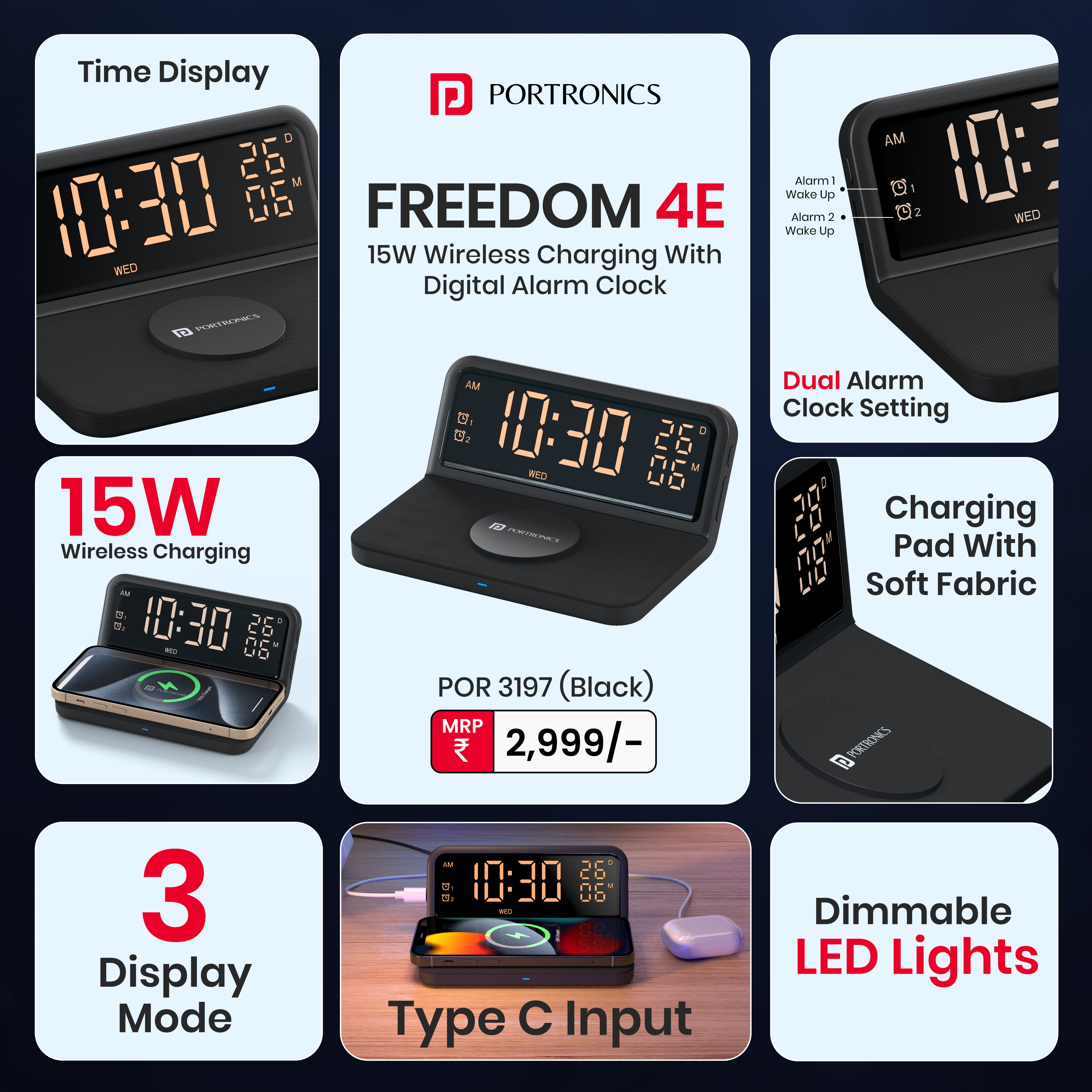 Dual Alarms & 3 Display Modes:Set separate wake-up times for work/weekend and switch between Bright/Normal/Night modes for sleep-friendly wireless charging nights
