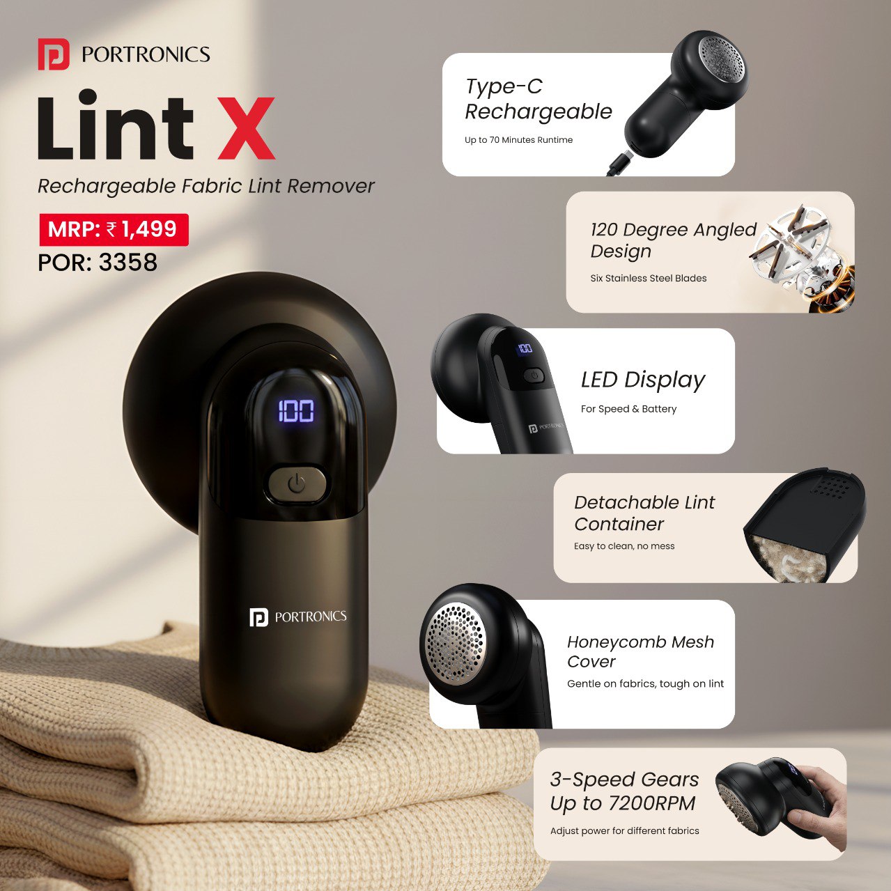Type-C Rechargeable Lint Remover | 6 Stainless Steel Blades | 3 Speed Modes | LED Display | Detachable Lint Container | 70 Minutes Runtime | For Sweaters, Coats & Shirts