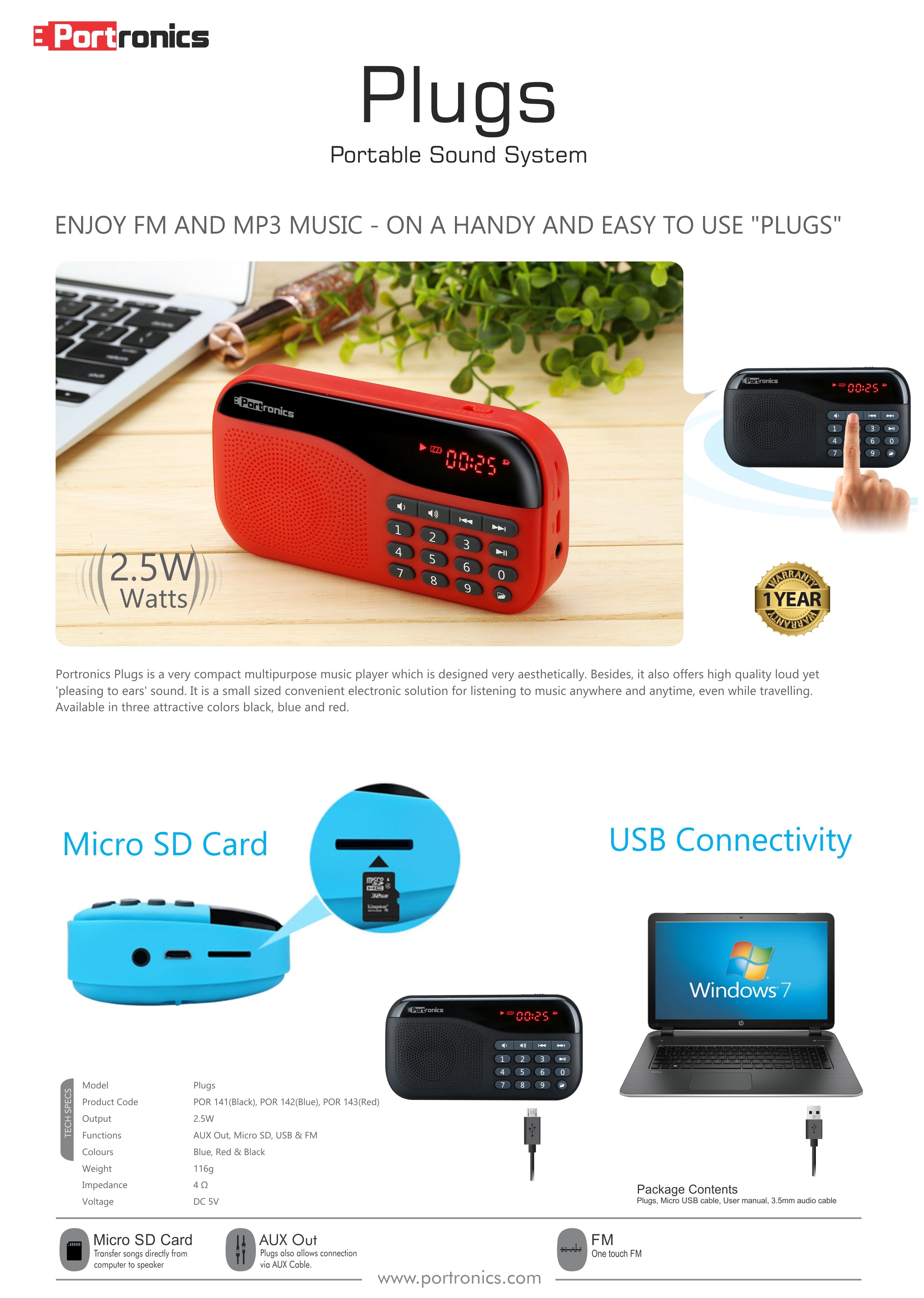 Plugs Mini Portable Speaker supports FM to let you listen to various radio channels delightfully. News, music, promotional ads, social messages, RJ's banter, cinema updates etc. Are heard by you in crystal-clarity owing to its built-in Antennae Design.