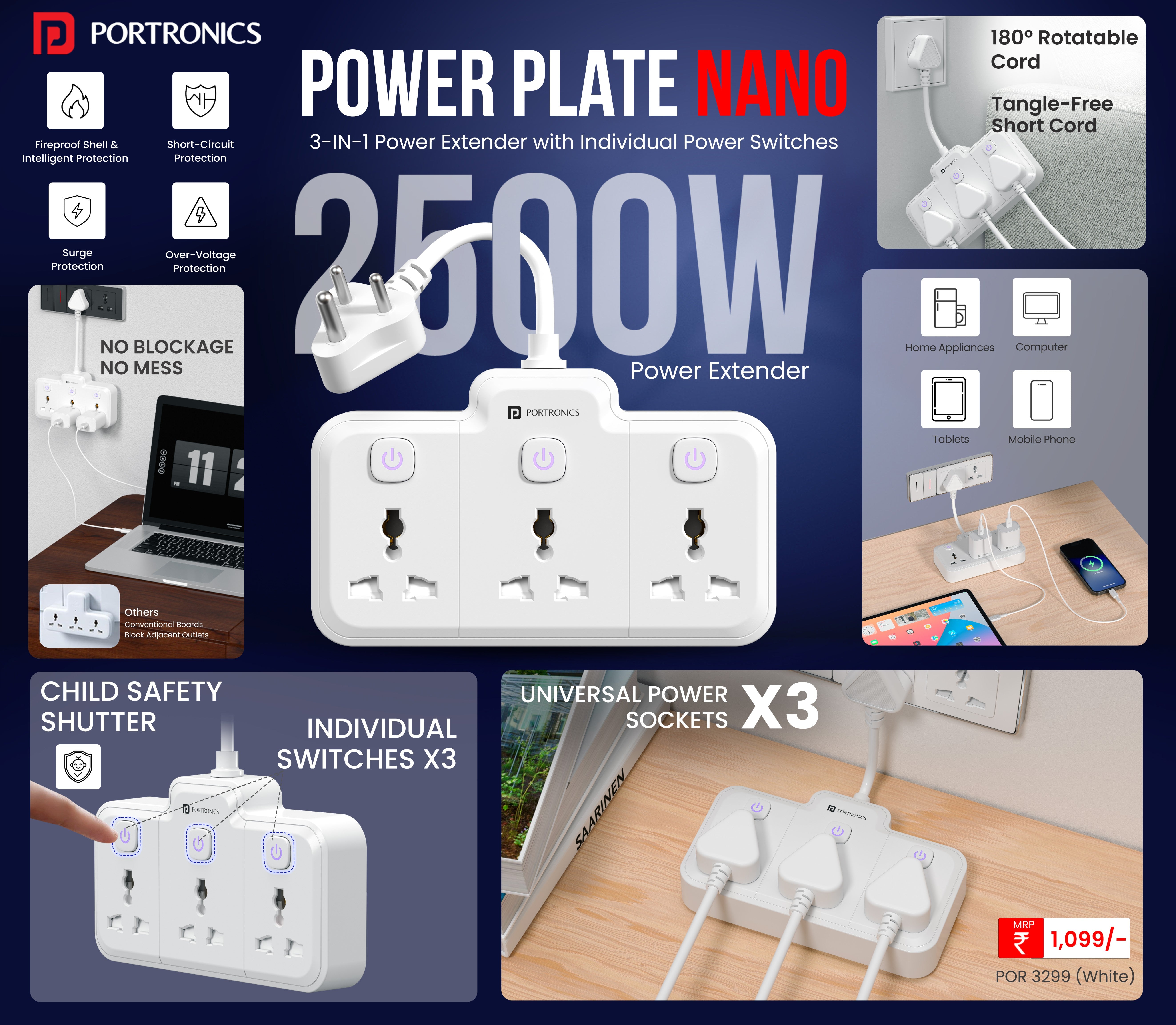 Power Extender with Flexible Cord | Individual Switches | Child Safety Shutters | For Home, Office, Laptops, Mobiles & Appliances