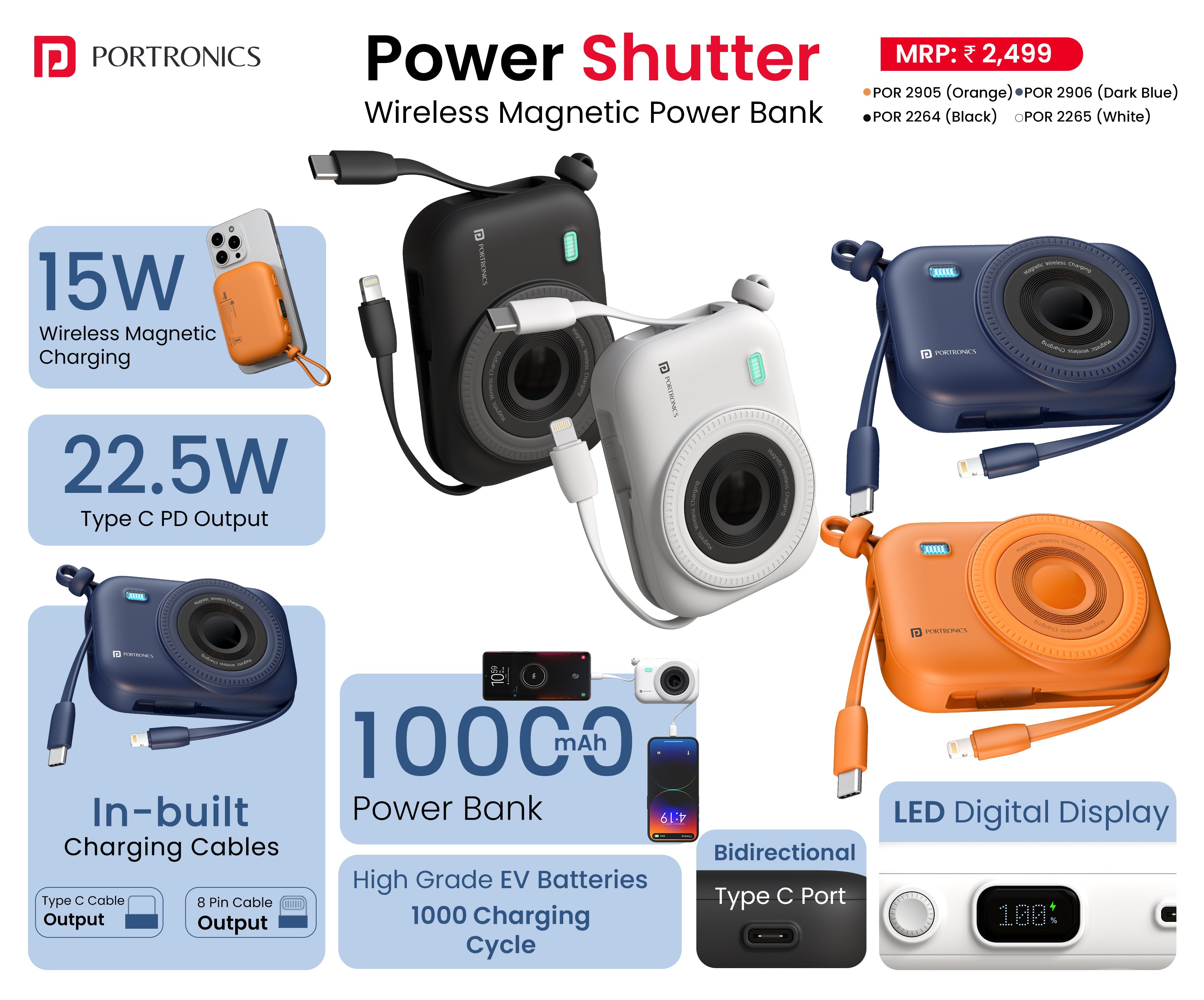 15W Wireless Charging | 22.5W Type C PD Output | In Built Type C & 8 Pin Cable | LED Display