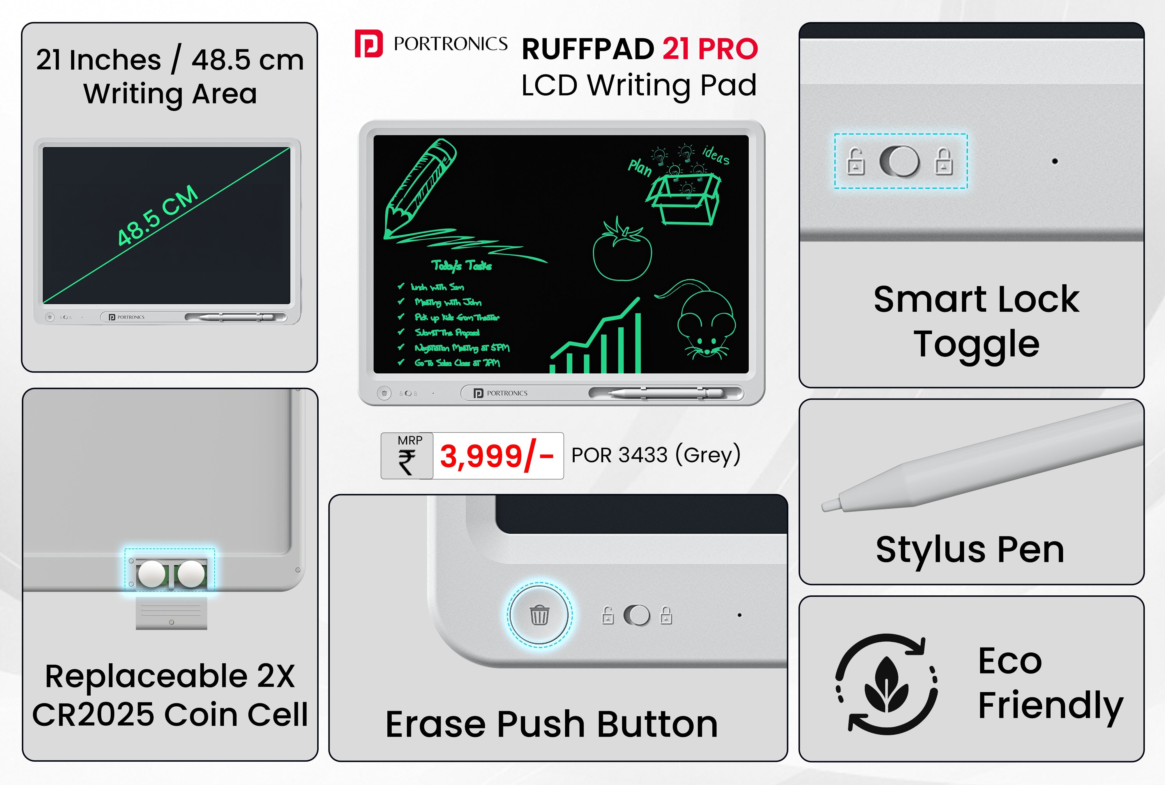 Eco-Friendly Digital Board | One-Tap Erase | Smart Lock Toggle | Stylus Pen Included | Doodling, Notes, Planning & Learning | 21 Inches Screen Size