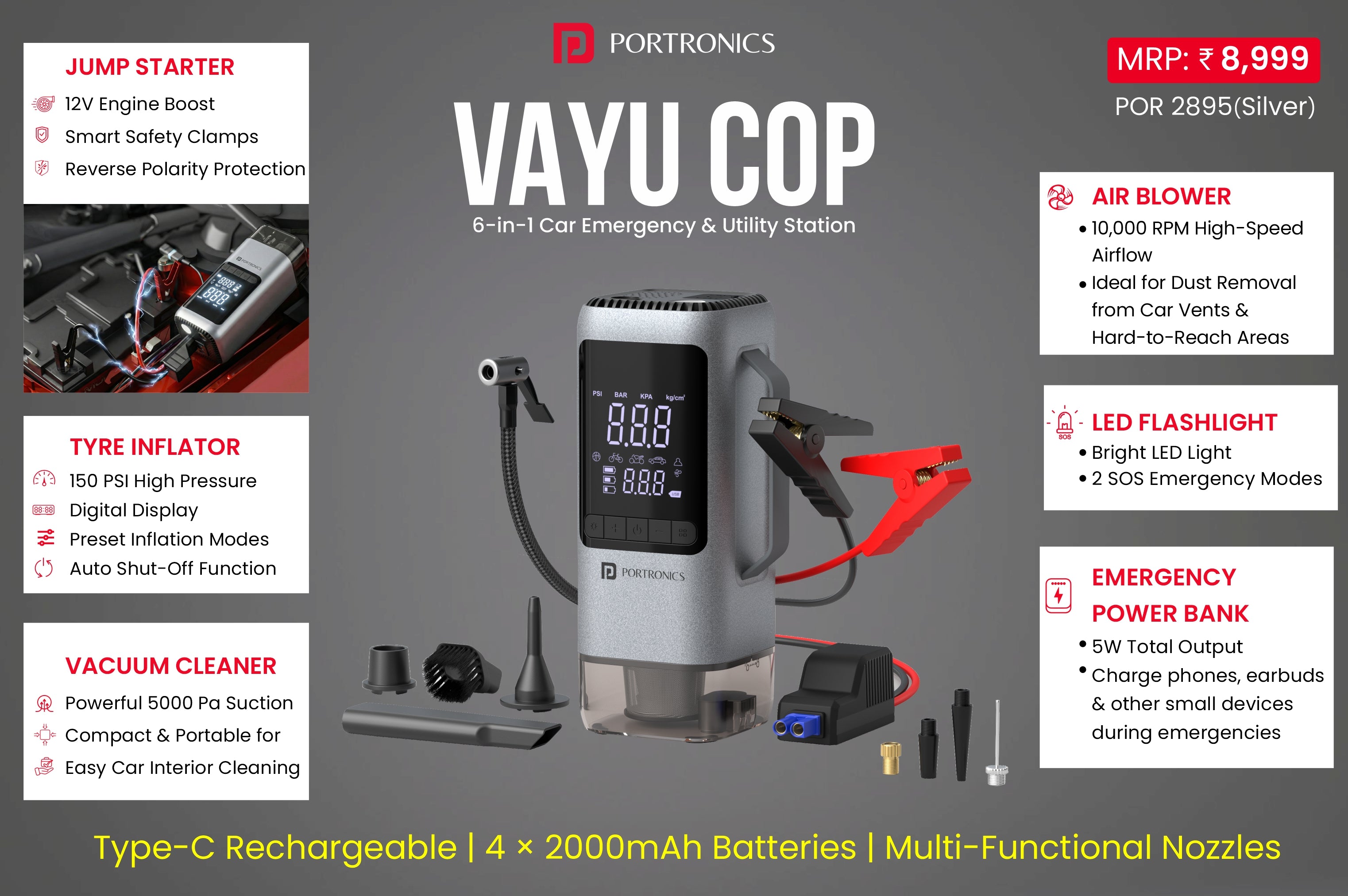 Type-C Rechargeable Utility Station | 4x 2000 mAh Batteries | BLDC Motor | 12V Jump Starter | 150 PSI Tyre Inflator | 5000 Pa Vacuum Cleaner | 10000 RPM Air Blower | LED Flashlight & 5W Power Bank
